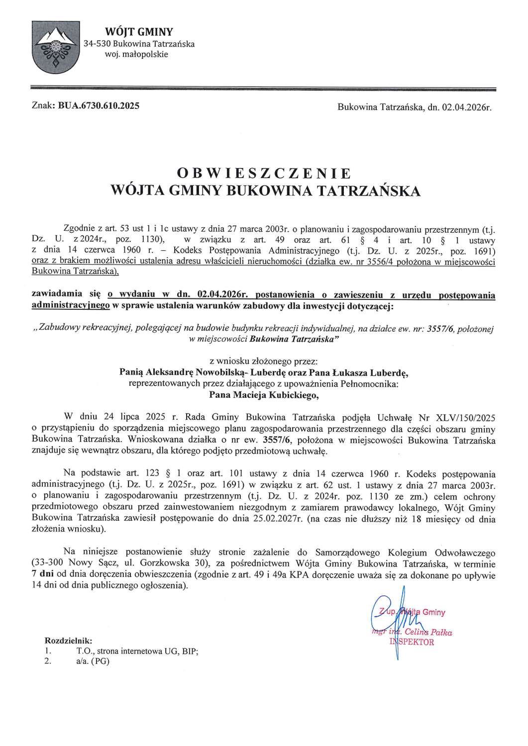 Obwieszczenie WGBT z dnia 02.04.2026r. o postanowieniu o zawieszeniu z urzędu postępowania administracyjnego, dot. postępowania o WZ, inwestycja prywatna, Bukowina Tatrzańska, rejon ul. Leśna, znak: BUA.6730.610.2025 (na podst. art. 53 ust 1c Ustawy o PiZP)