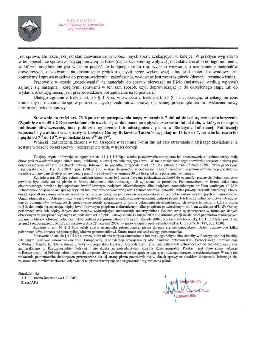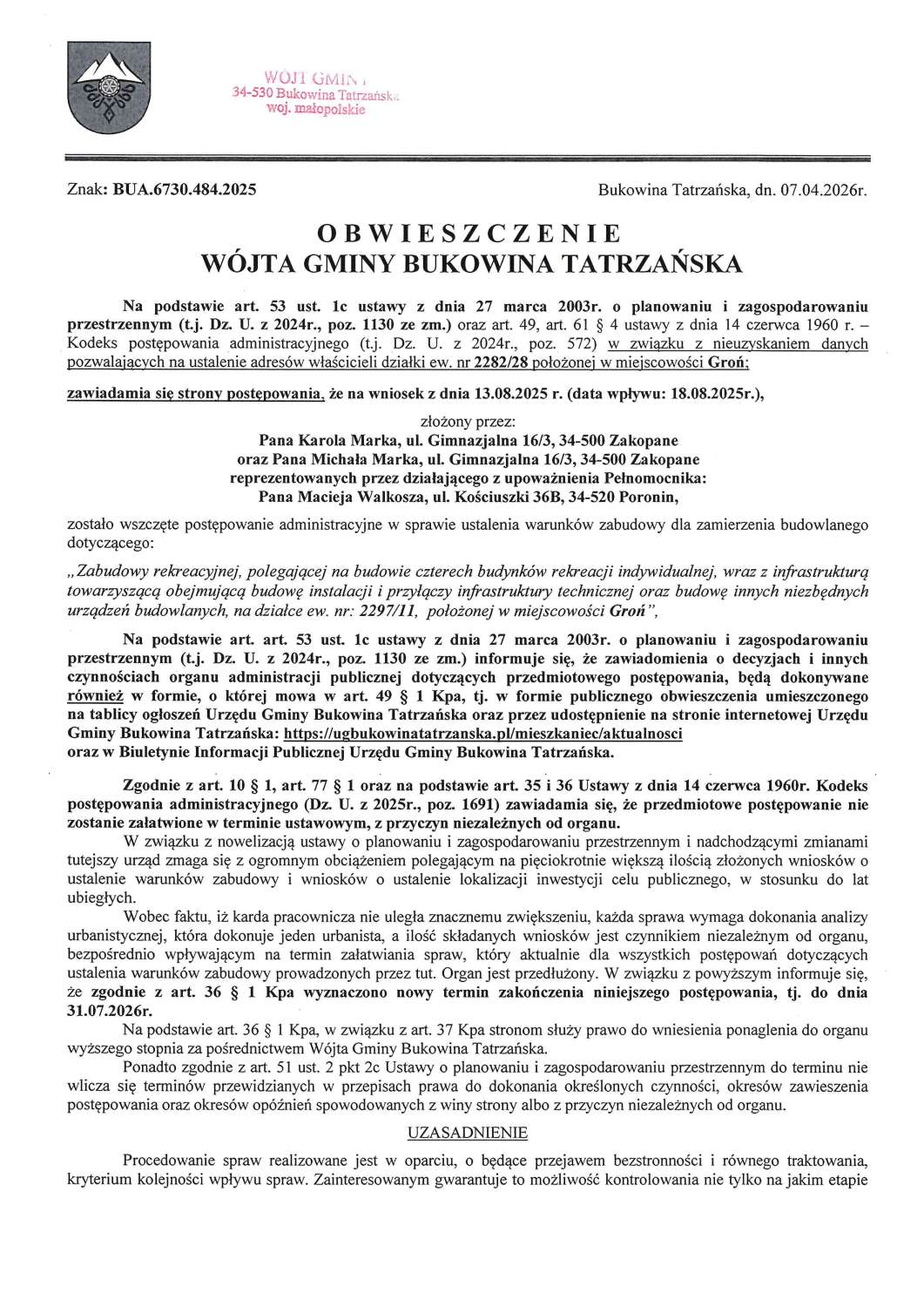 Obwieszczenie z dnia 07.04.2026r. Wójta Gminy Bukowina Tatrzańska znak: BUA.6730.484.2025