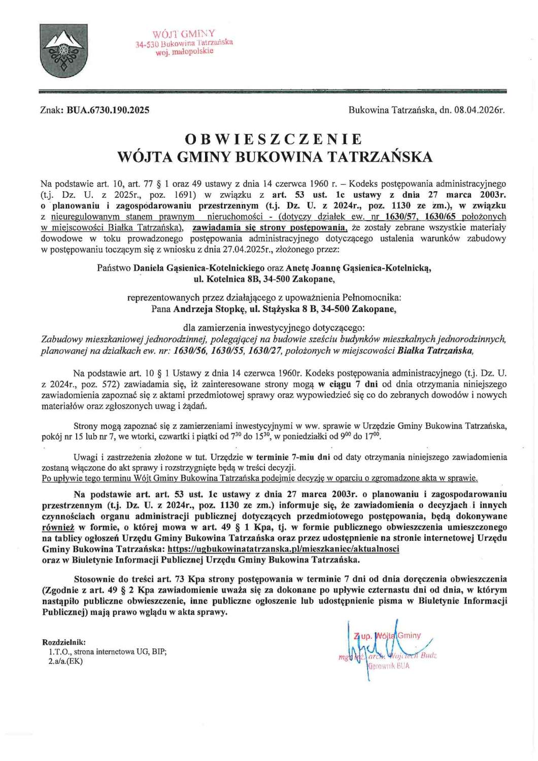Obwieszczenie z dnia 08.04.2026r. Wójta Gminy Bukowina Tatrzańska znak: BUA.6730.190.2025