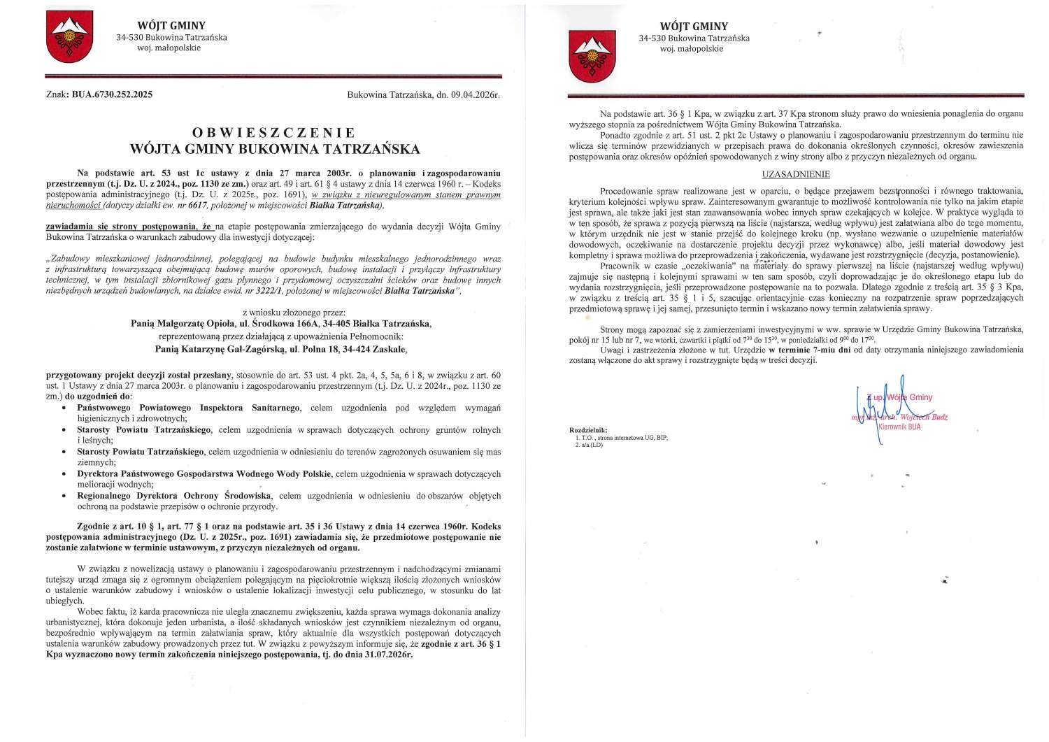 Obwieszczenie z dnia 09.04.2026r. Wójta Gminy Bukowina Tatrzańska znak: BUA.6730.252.2025