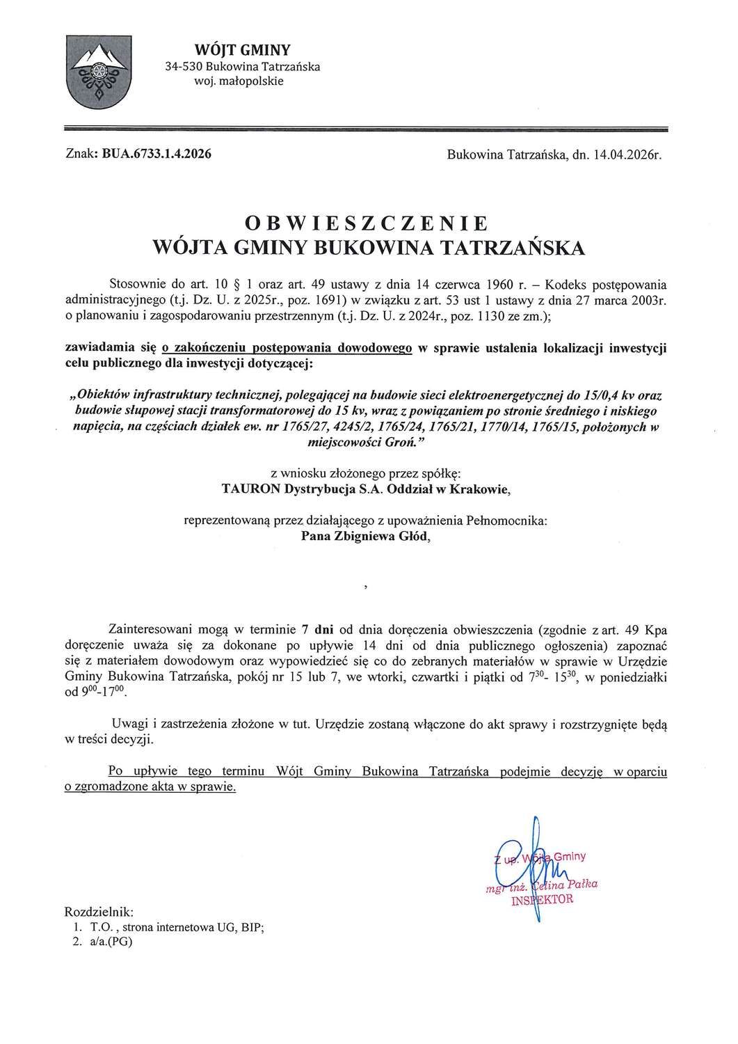 Obwieszczenie z dnia 14.04.2026r. Wójta Gminy Bukowina Tatrzańska znak: BUA.6733.1.4.2026