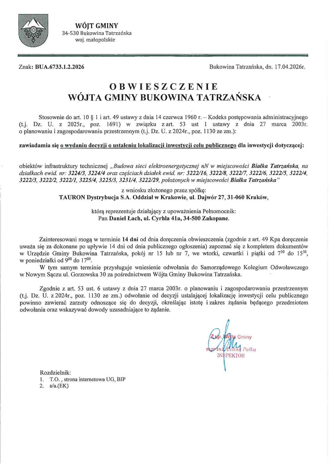 Obwieszczenie Wójta Gminy Bukowina Tatrzańska o wydaniu w dniu 17.04.2026r. Decyzji ulicp znak: BUA.6733.1.2.2026 dotyczącej budowy odcinka sieci energetycznej, Białka T. rejon ulicy wewnętrznej w okolicy remizy OSP (na podstawie art. 49 Kpa, w związku z art. 53 ust. 1 uopizp)