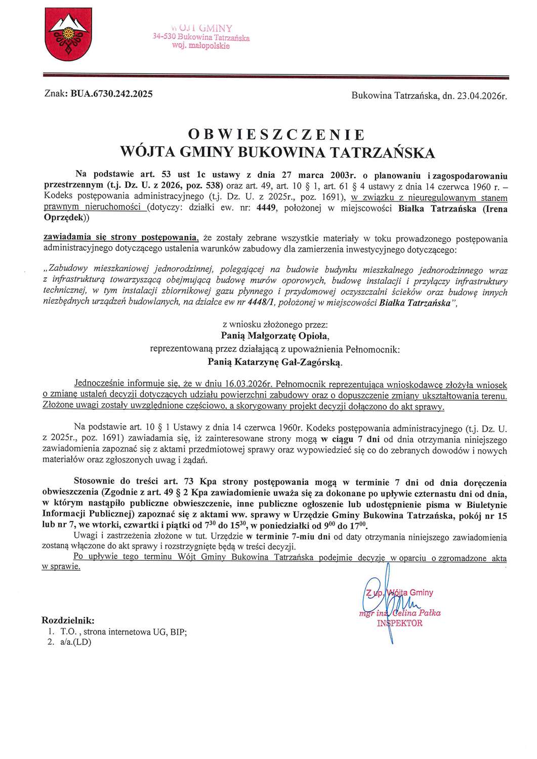 Obwieszczenie z dnia 23.04.2026r. Wójta Gminy Bukowina Tatrzańska znak: BUA.6730.242.2025