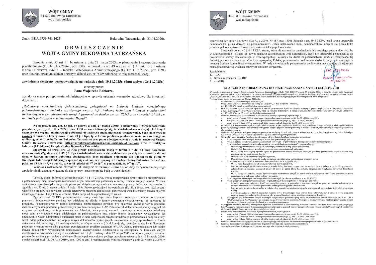 Obwieszczenie z dnia 23.04.2026r. Wójta Gminy Bukowina Tatrzańska znak: BUA.6730.741.2025