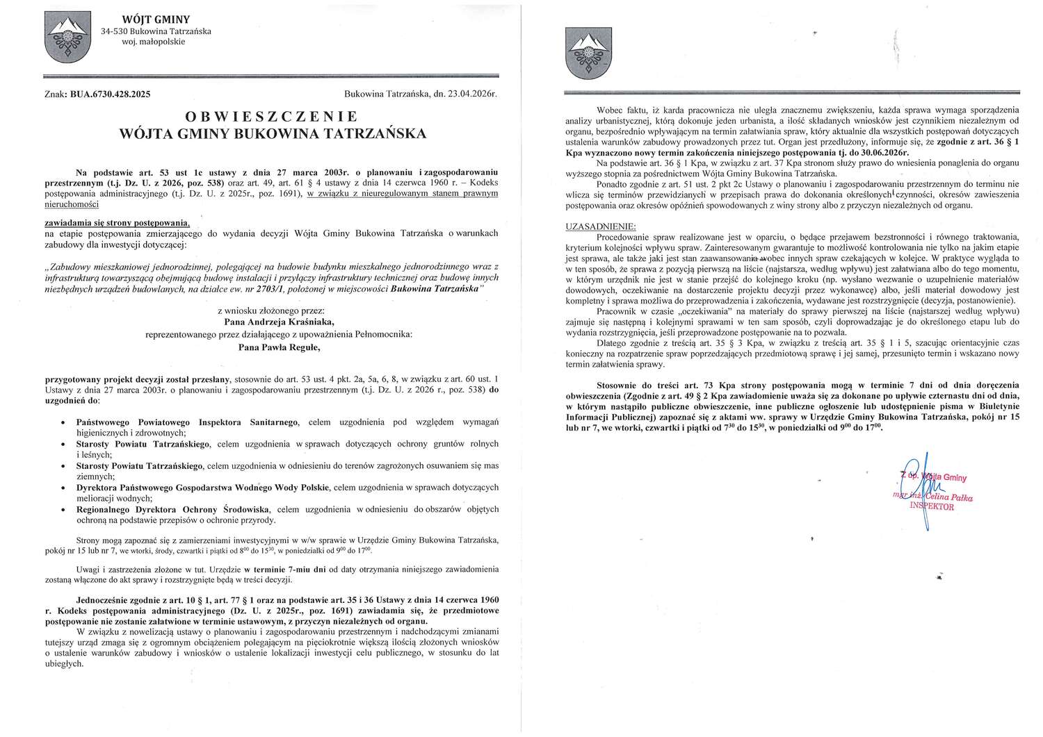 Obwieszczenie z dnia 23.04.2026r. Wójta Gminy Bukowina Tatrzańska znak: BUA.6730.428.2025