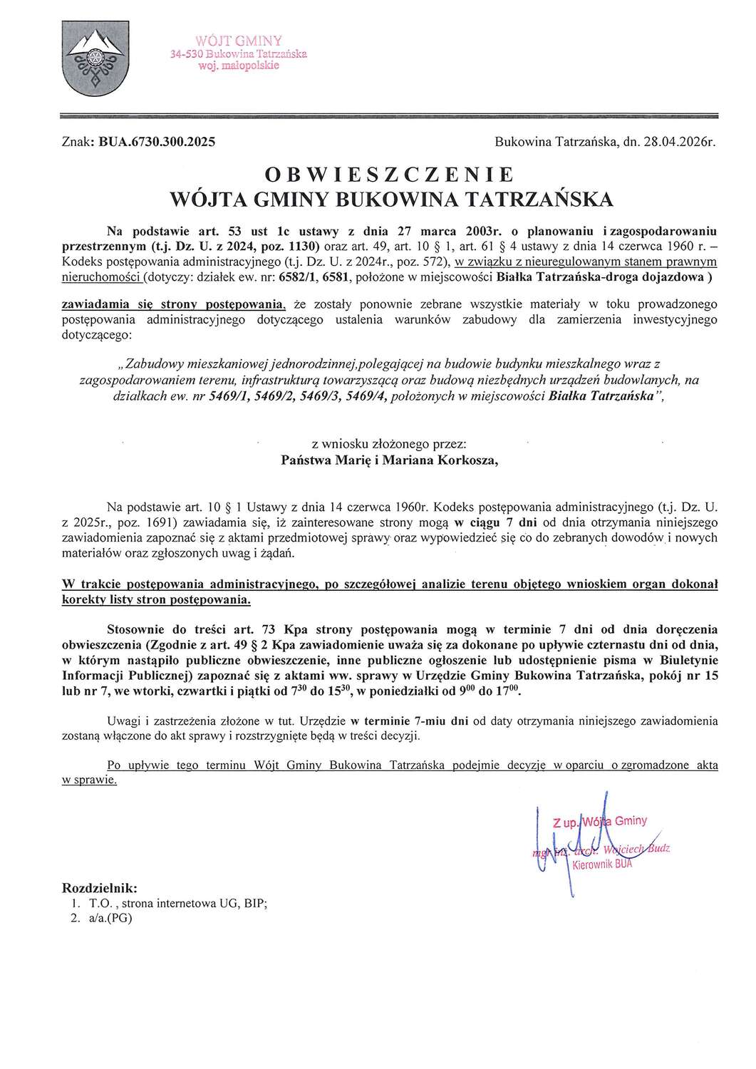 Obwieszczenie z dnia 28.04.2026r. Wójta Gminy Bukowina Tatrzańska znak: BUA.6730.300.2025