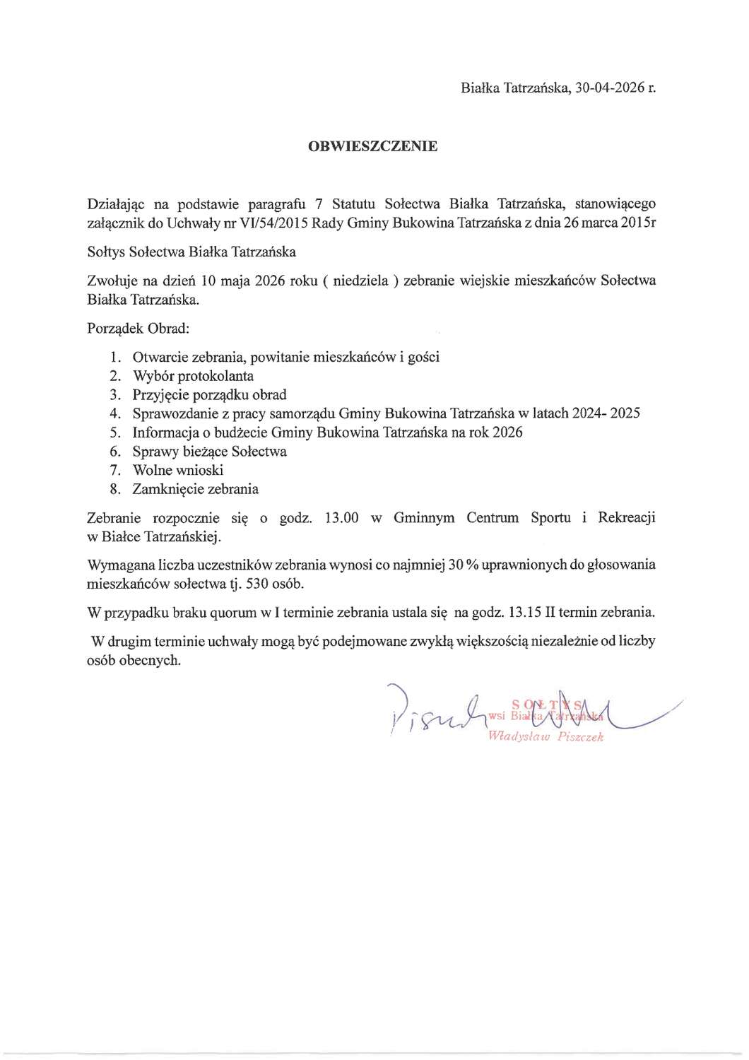 Obwieszczenie Sołtysa Sołectwa Białka Tatrzańska